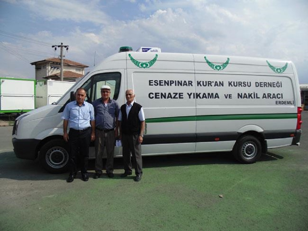 Mersin İli Erdemli İlçesi Esenpınar Kur’an Kursu Yaptırma ve Yaşatma Derneğine 2014 model Volkswagen Crafter panelvan araç içi ,siren sistem tepe lambalı,12 volt soğutuculu(hareket halinde soğutma yapabilen), aynı zamanda hayat belirti sensörlü,no-frost 220 volt morglu (araç stop halinde soğutma yapabilen)sistem, elektrikli ve hermetik(dijital ayarlamalı)LPG şofbenli, 200 Lt.temiz su,200 Lt atık su depolu, hidrofor sistemli yıkama ve nakil aracı kısa sürede yapılarak teslim edilmiştir,